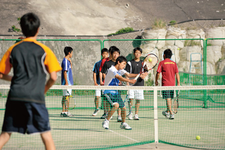男子は、全国選抜高校テニス大会に過去20回の出場経験があります。校内には6面のテニスコートがあり、全国大会をめざして日々練習をしています。