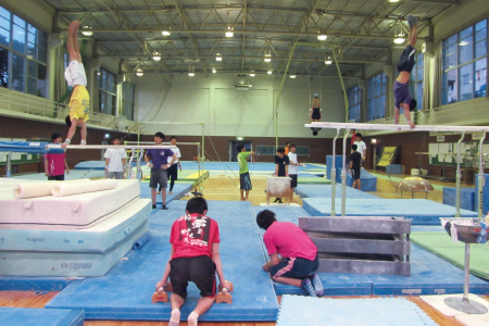 第3体育館を専用練習場にしています。男女合わせて10種目の器具がそろい、床フロア1面もあります。インターハイにも出場しています。