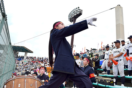 野球部やサッカー部の福岡県大会の大一番に駆けつけ、全身全霊で勝利に向かって応援します。頑張る九国生への応援は、私たちに任せてください!